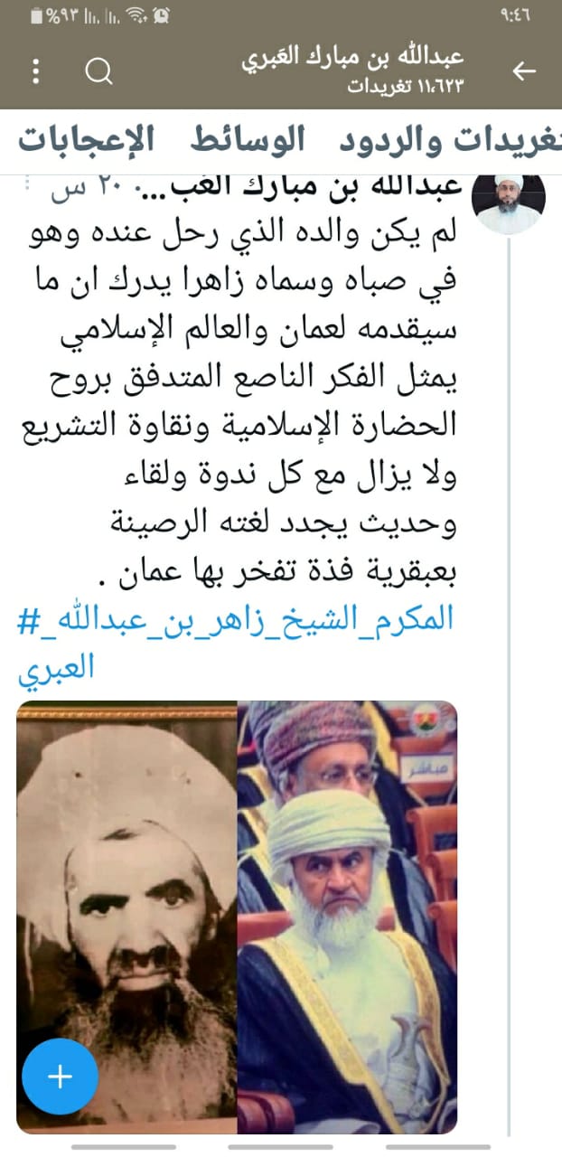من خلال متابعتي لبرنامج تويتر قرأت تغريدة للشيخ الدكتور عبدالله بن مبارك بن سيف العبري يتحدث فيها مشيدا بفكر الشيخ المكرم زاهر بن عبدالله بن محمد العبري ، فلاقت تلك التغريدة مني استحسانا فقلت في ذلك أبيات متواضعة